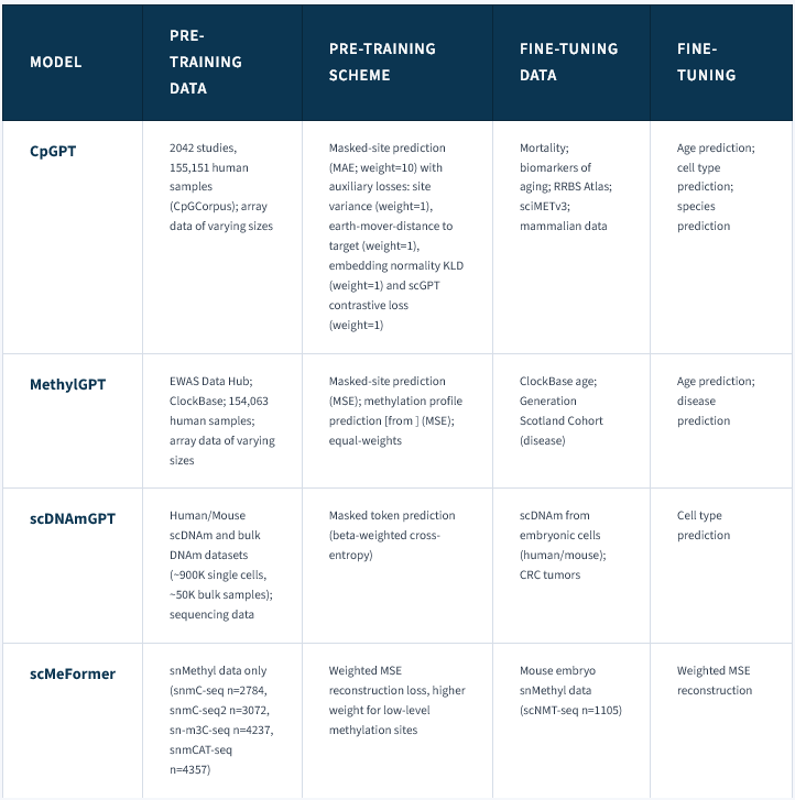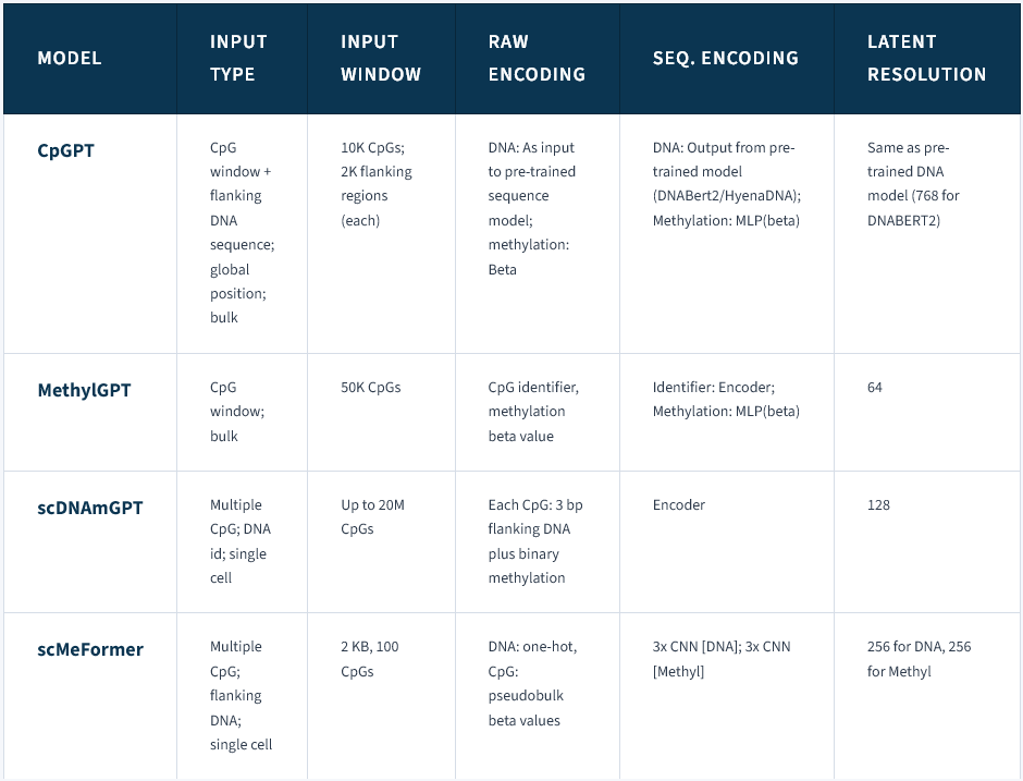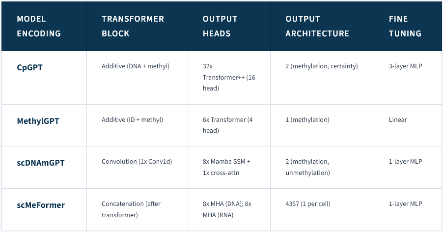 A quirk of history bifurcated the world of epigenetics into two camps - DNA methylation and chromatin – and, as such, the landscape of foundation models is no different. Indeed, the sequence-to-function models considered in our last blog included AlphaGenome and GENA-LM, which operate at base-pair (or token) resolution. As such, these models could have incorporated methylation state as an output, but neither model included methylation data as an output head, likely due to scope rather than feasibility. This new blog focuses on a set of foundation models that aim to recapitulate or predict methylation: scMeFormer, scDNAm-GPT, MethylGPT, and CpGPT.
