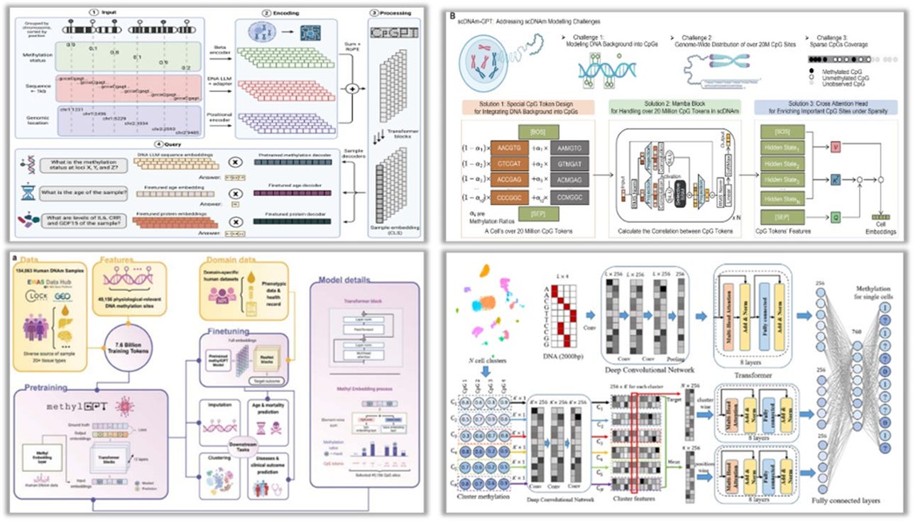 Each of the foundation models highlights a different aspect. CpGPT highlights robust performance on imputation and DNA methylation-age prediction, and extension of the chain-of-thought to imputation tasks. MethylGPT focuses on the effectiveness of methylation for predicting disease and treatment response. For single-cell models, scDNAmGPT highlights the MAMBA architecture’s training speed, pseudotime inference, and clustering performance, whereas scMeFormer highlights non-degradation in clustering performance with downsampling, heritability enrichment, and imputation-driven DMR inference.